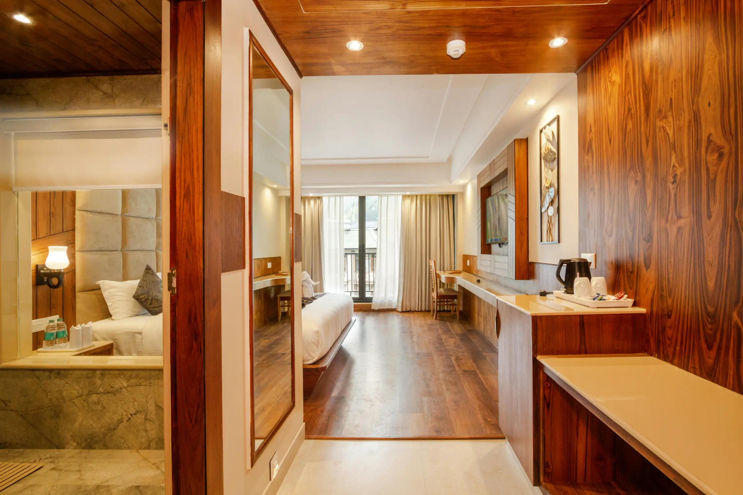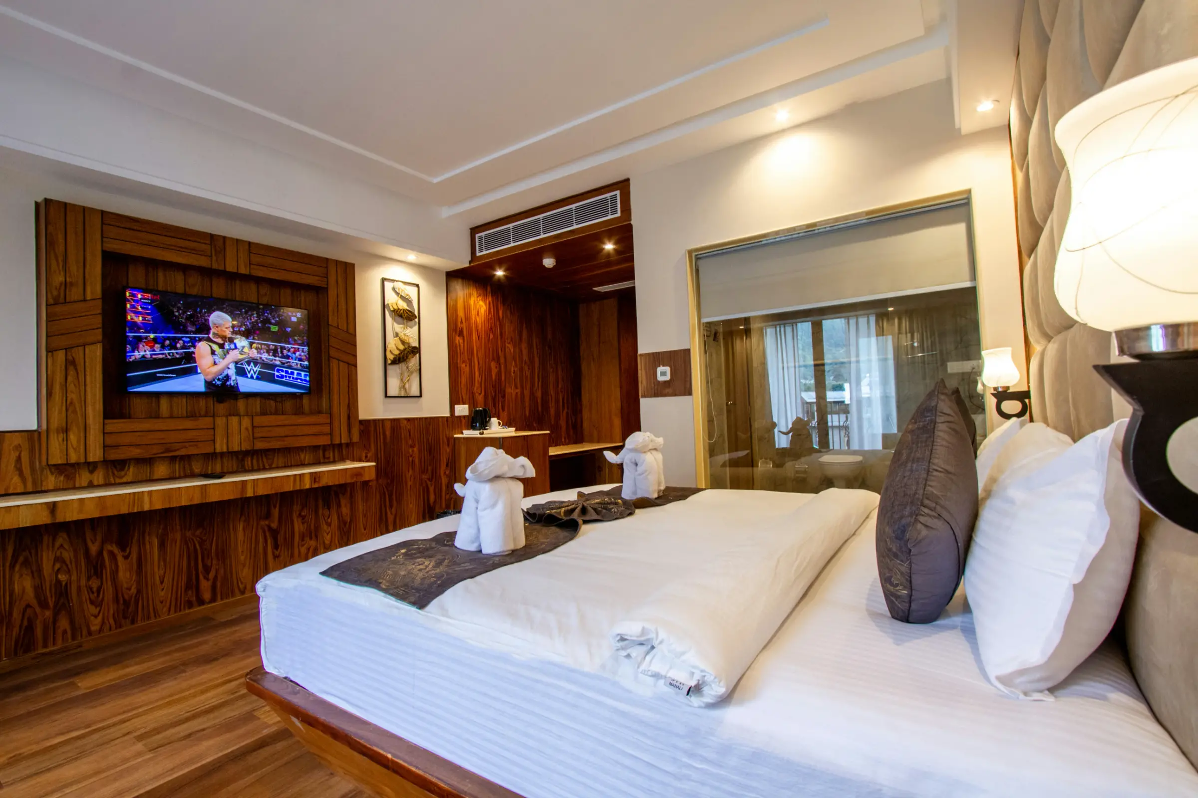 Experience the pinnacle of mountain luxury in our exclusive two-story penthouse. This stunning suite features a dramatic open-concept design with vaulted ceilings, a gourmet kitchenette, and access to a private rooftop terrace with hot tub and 360-degree views. The master bedroom includes a California King bed and spa bathroom with dual vanities. Perfect for discerning travelers seeking ultimate privacy and indulgence.